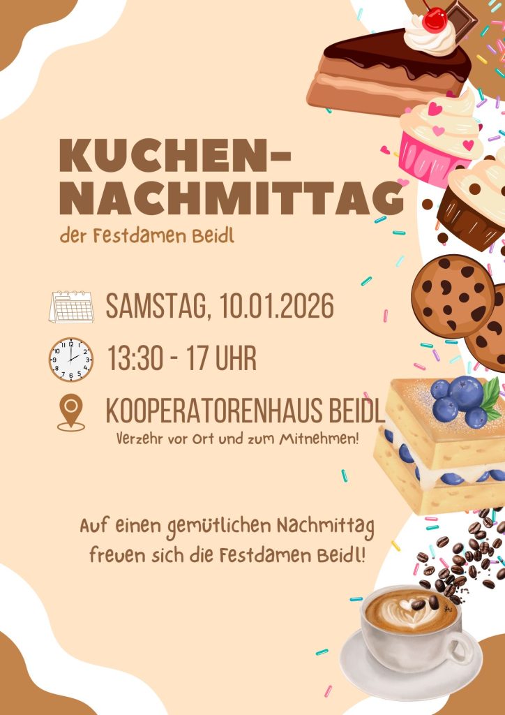 Die Festdamen Beidl laden am Samstag, den 10.01.2026 zwischen 13:30 Uhr und 17:00 Uhr zum Kuchen-Nachmittag in das Kooperatorenhaus ein. Dort könnt ihr euch mit leckeren Kuchen zum Verzehr vor Ort oder zum Mitnehmen versorgen.