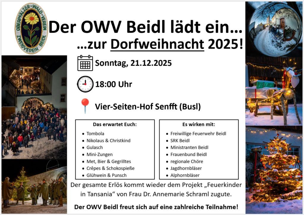 In dieser Zeit der freudigen Vorbereitung gibt es viele Gelegenheiten, egal ob im Fernsehen oder oft auch per Brief, Geld für karitative Zwecke zu spenden. Ganz zu schweigen von den anderen modernen Formen der Kommunikation. Es gibt aber eben auch kleinere Vereine, die für ein ganz bestimmtes Projekt Guthaben spenden. Genau so einer ist es im Dorf Beidl bei Plößberg im Landkreis Tirschenreuth. Federführend ist der Oberpfälzer Waldverein, Zweigverein Beidl; am Sonntag, 21. Dezember 2025, findet die 19. Dorfweihnacht statt. Aber hier hält das gesamte Dorf, etwa 350 Einwohner, zusammen.